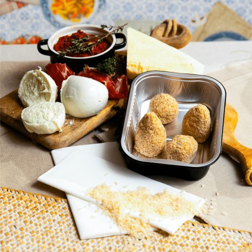 Ingrediënten nDuja: rijst, saffraan, Nduja, gepasteuriseerd eigeel, mozzarella, paneermeel, olijfolie, boter, zout, peper –