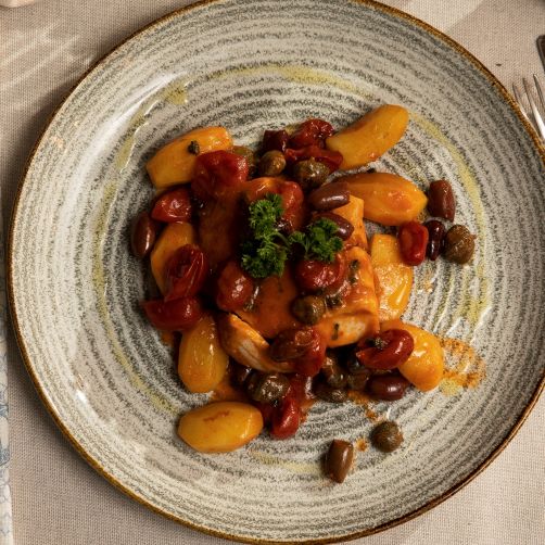Zoals de moeder van Giuseppe dit typisch zuiderse visgerecht het liefste maakt: in een smaakvolle saus met Olijven, Kappertjes en Kerstomaatjes. Heerlijk met Aardappeltjes en/of Salade.
