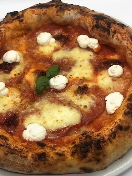 Tomatensaus, Mozzarella Fiordilatte, N’duja (pittige Italiaanse versie van ossenworst uit Calabrië), Salami ventricina, Ricotta, Extra Vergine Olijfolie