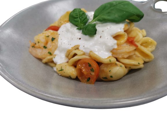 Orecchiette met Cherrytomaten, geflambeerde Gamba’s en Burrata