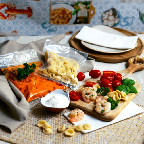 Orecchiette met Cherrytomaten, geflambeerde Gamba’s en frisse Burrata
