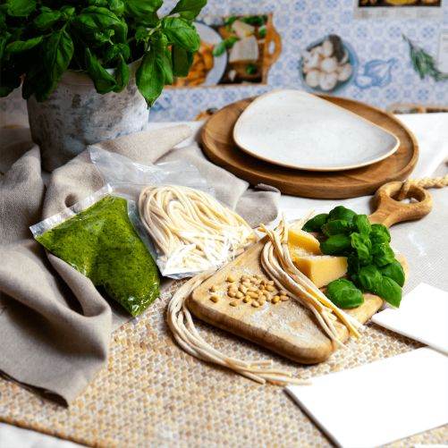 Dit top pastagerecht uit Genua heeft een sterk en typisch aroma van Basilicum. De combinatie van basilicum met parmigiano, pecorino en pijnboompitten geeft een wonderlijke smaak en is een topper in de regio Ligurië. In combinatie met de Spaghetti alla Chitarra, een wat dikkere, vierkant gesneden verse spaghetti is dit een zeer geliefd gerecht bij de jong & oud.